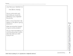 4MAT 4 Algebra Student Activity Book page 3 Use this student page for this "Connect" activity. Objective: Students should recognize the importance of using precise terminology, giving accurate directions and being a good listener. Activity: Have students react to the block activity. Discuss what was successful, what needed improvement. What do you feel is more important: listening or giving directions? Assessment: Check for understanding through a class discussion. Getting ready This is the “Attend” octant of the unit, Step Two. This activity examines what just took place and begins to clarify the reason behind the learning. Activity directions Have students react to the block activity in their workbook using page 3. Discuss what went well and what the students might have done differently if they repeated the activity. What is more important: listening or giving directions? What are important aspects of good communication? Did you have that feeling of not knowing what to say to describe what you were trying to do?
